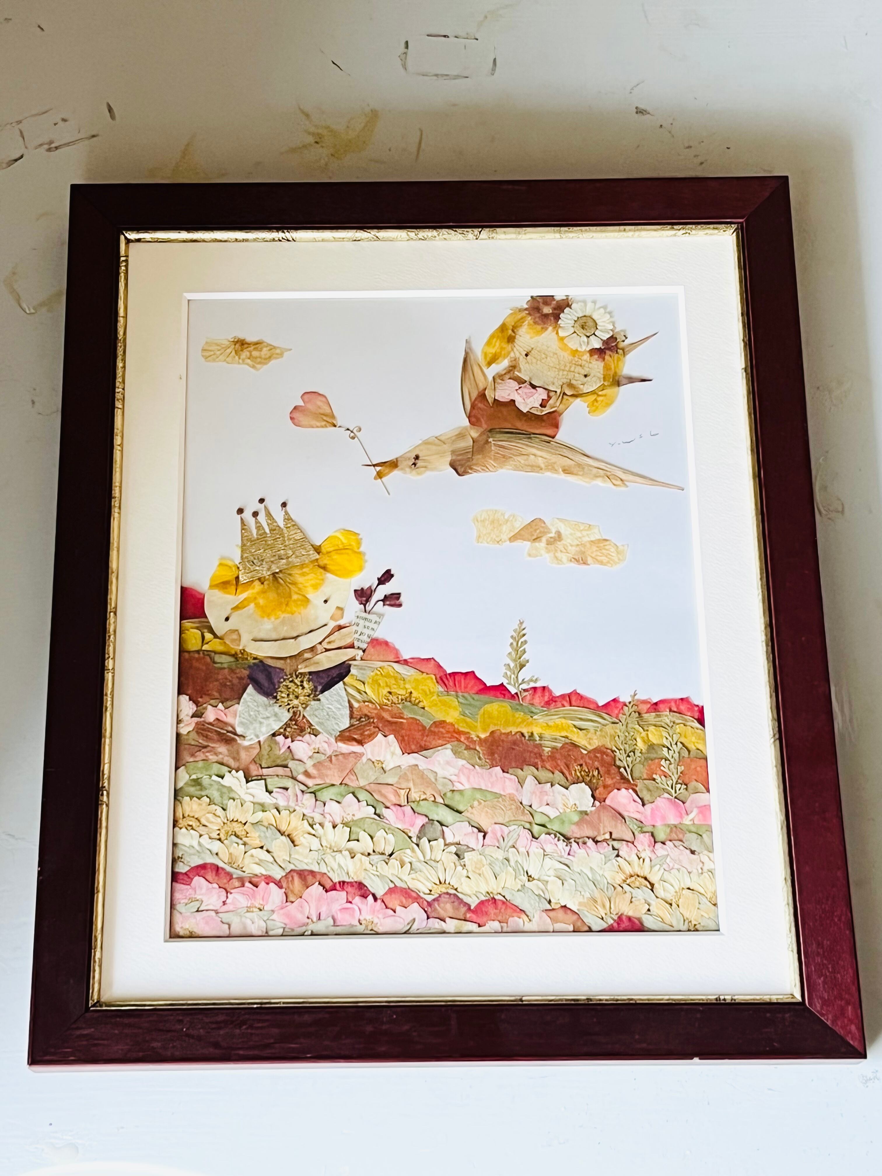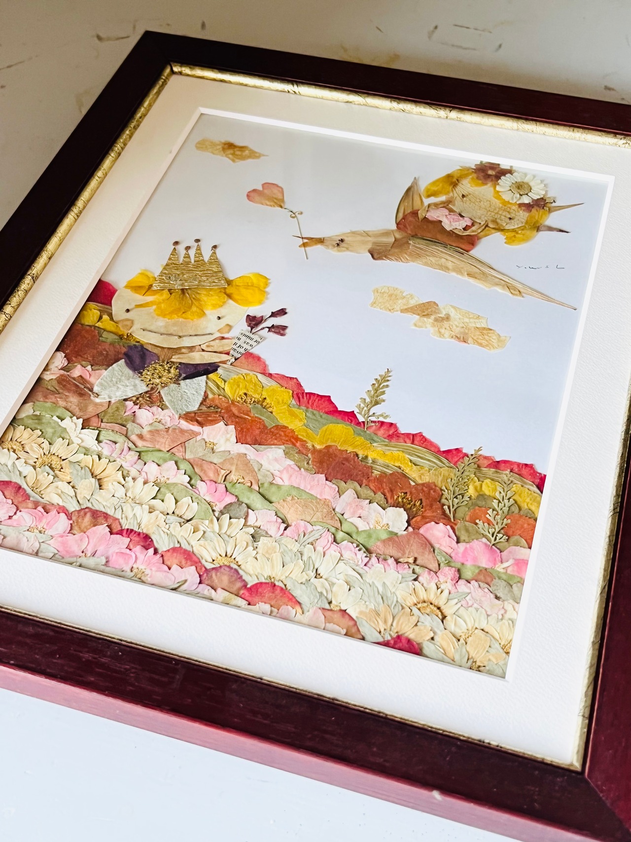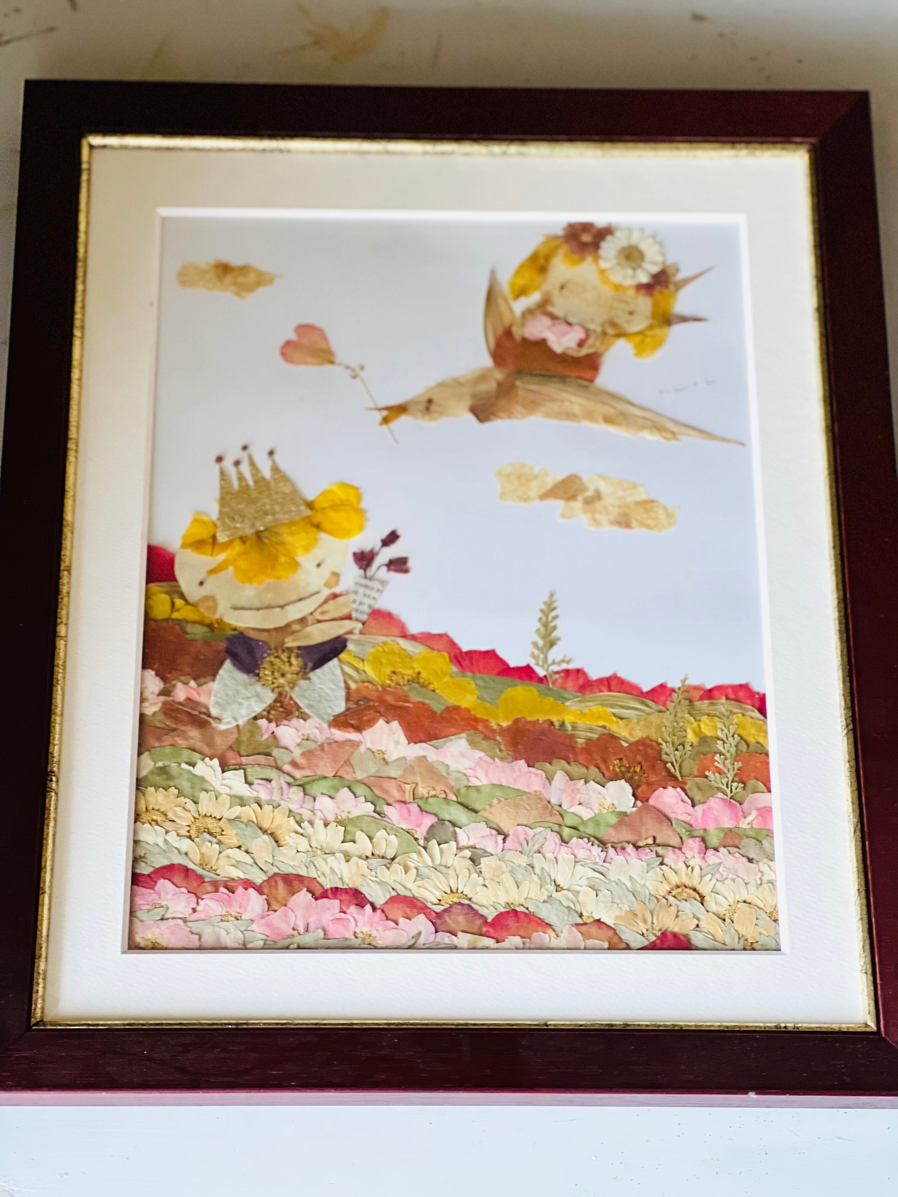 「つばめに乗った親指姫」の場面の押し花アートです。