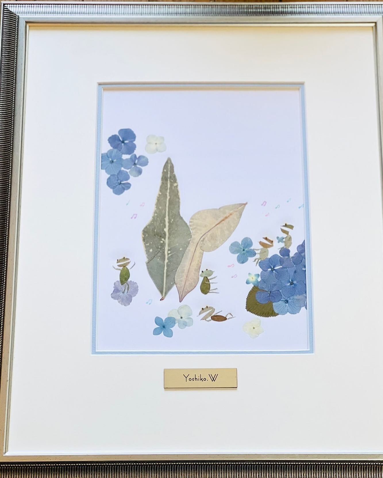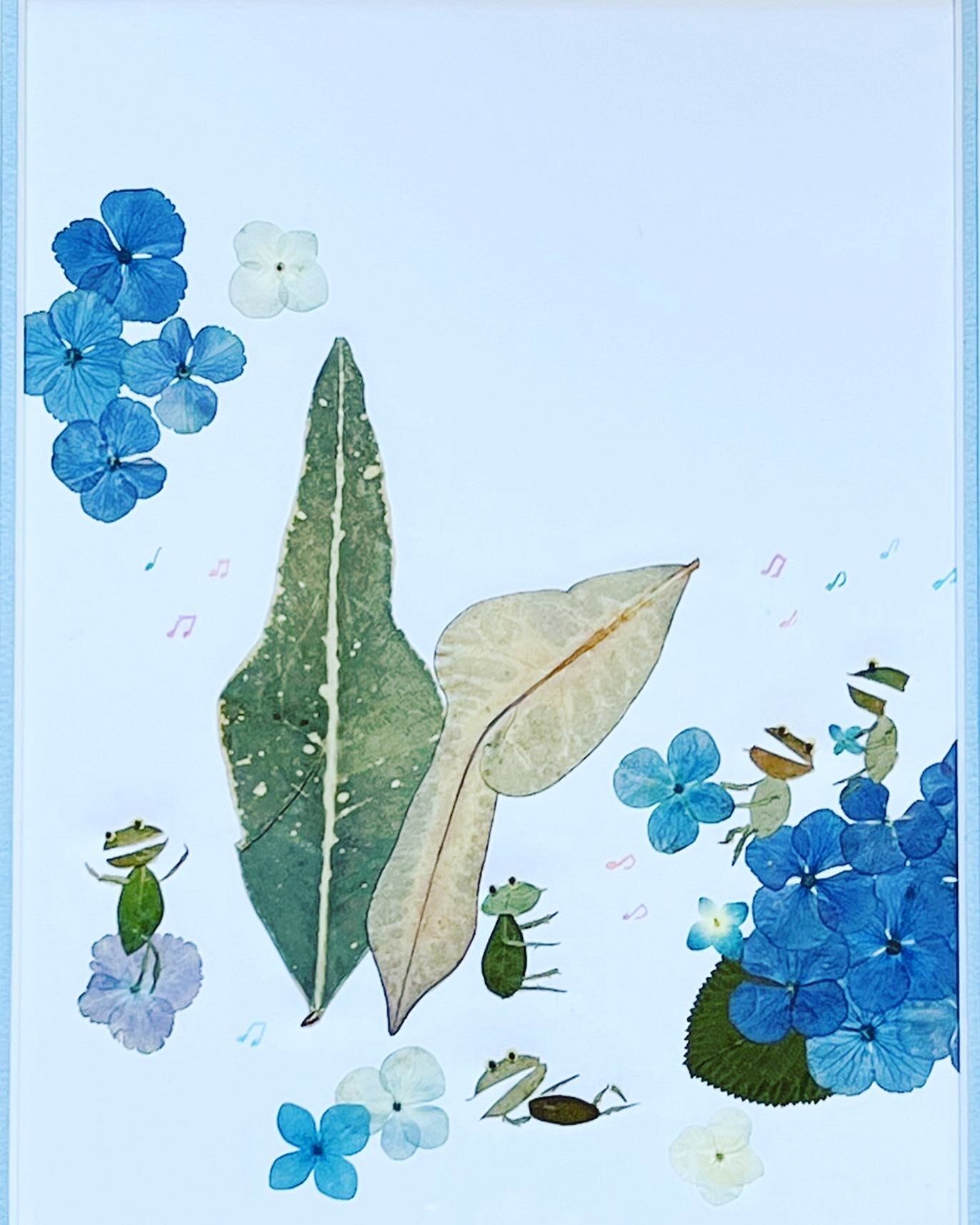 アジサイの上で遊ぶカエルたちの押し花コラージュ作品