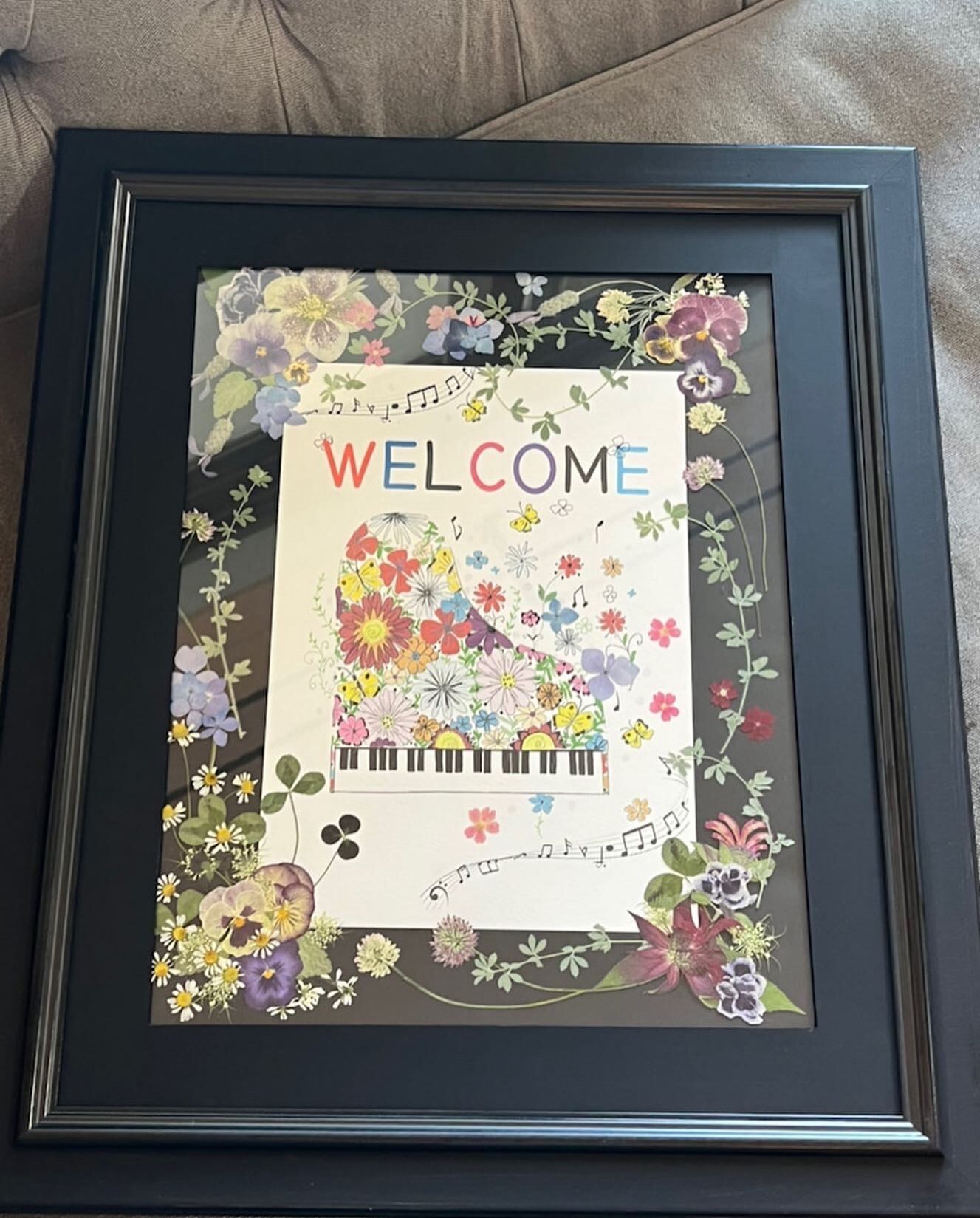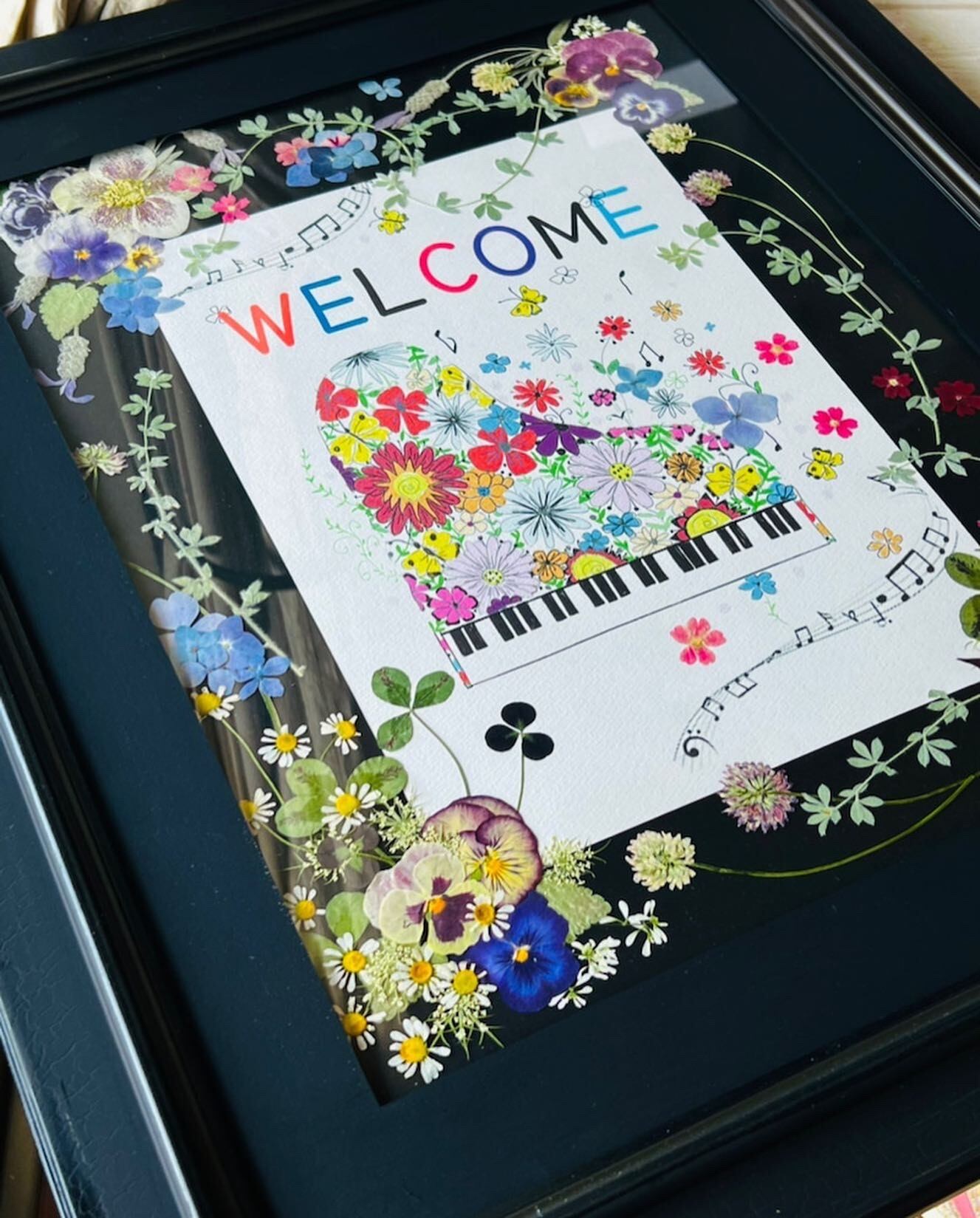 そのようなイメージで描いたイラストに押し花をデザインいたしました