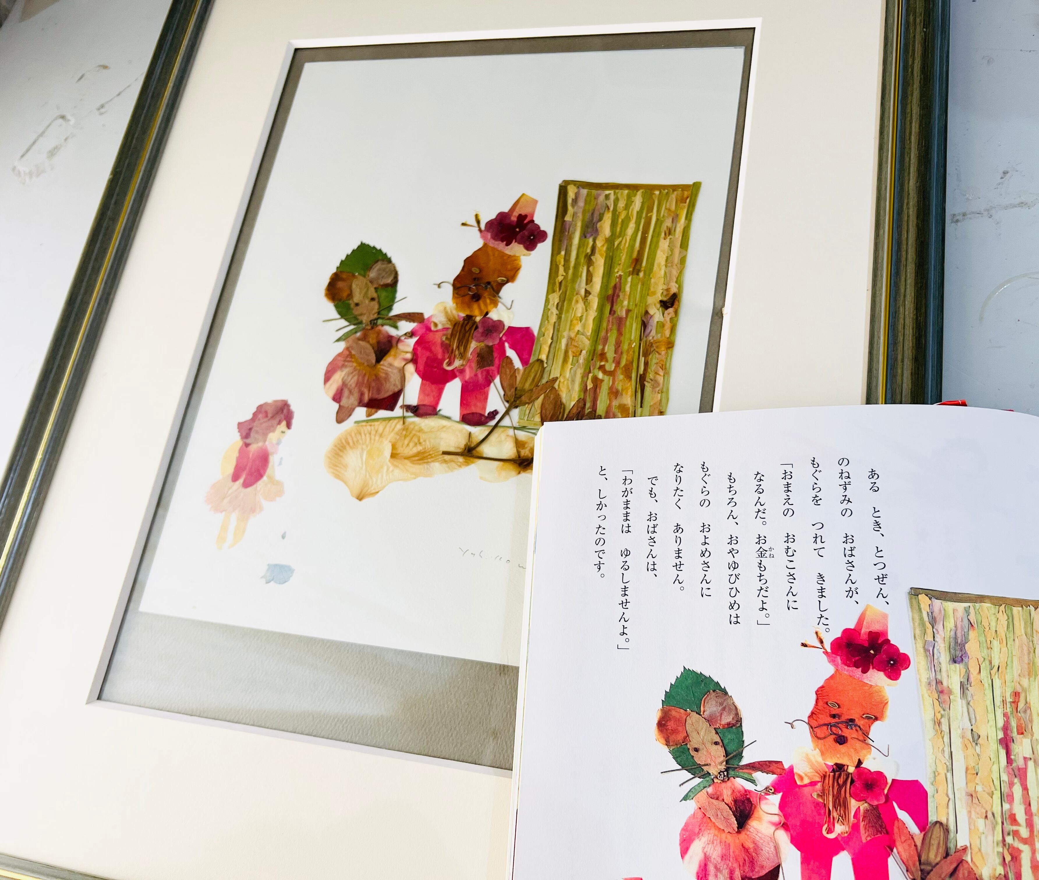 押し花 額 よみきかせおはなし絵本1「おやゆびひめ」(成美堂刊)挿絵「ねずみのおばあさんにもぐらとの結婚をすすめられるおやゆびひめ」 | YOSHIKO WAKABAYASHI 押花・イラストショップ